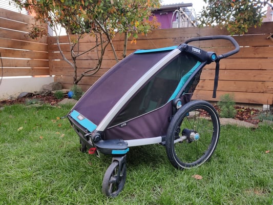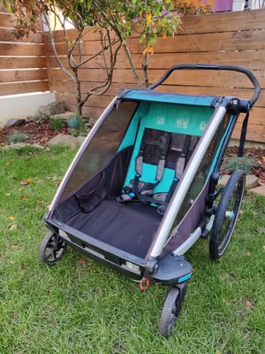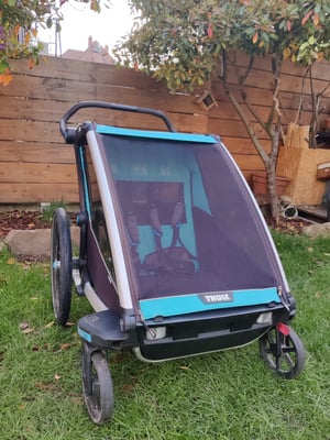 Wir bieten unseren neuwertigen Thule Fahrradanhänger zum Verkauf an. Doppelsitzer, mit Regen- und Sonnenschutz, Verkehrsfahne und Babyhängematte.