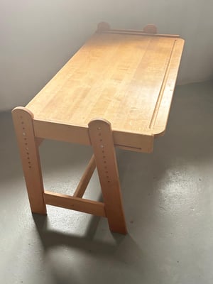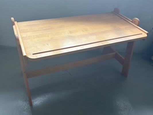 B 128 cm, T 69 cm, H bis 77 cm / Höhen- und Neigungswinkel verstellbar.