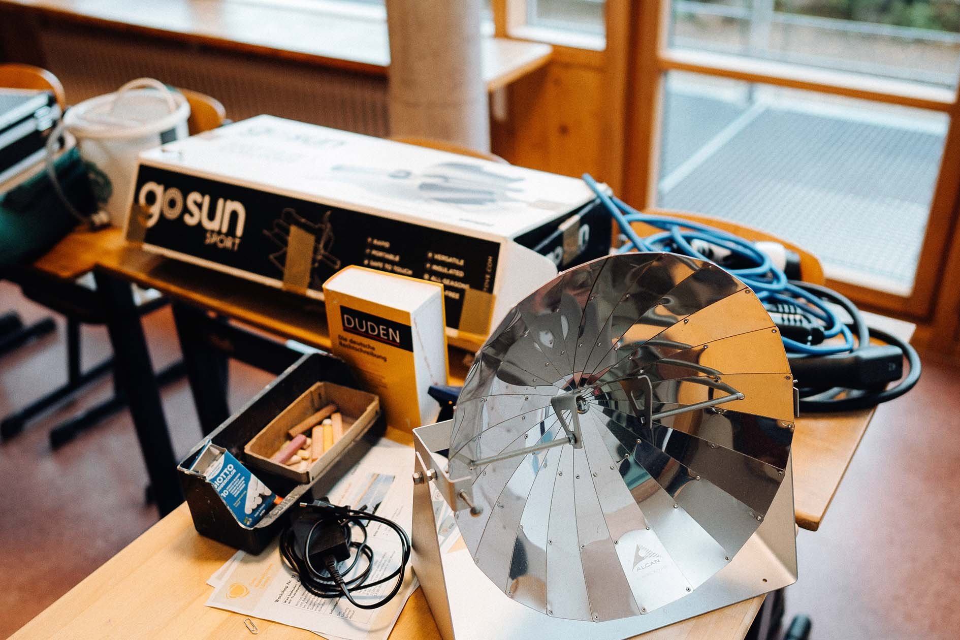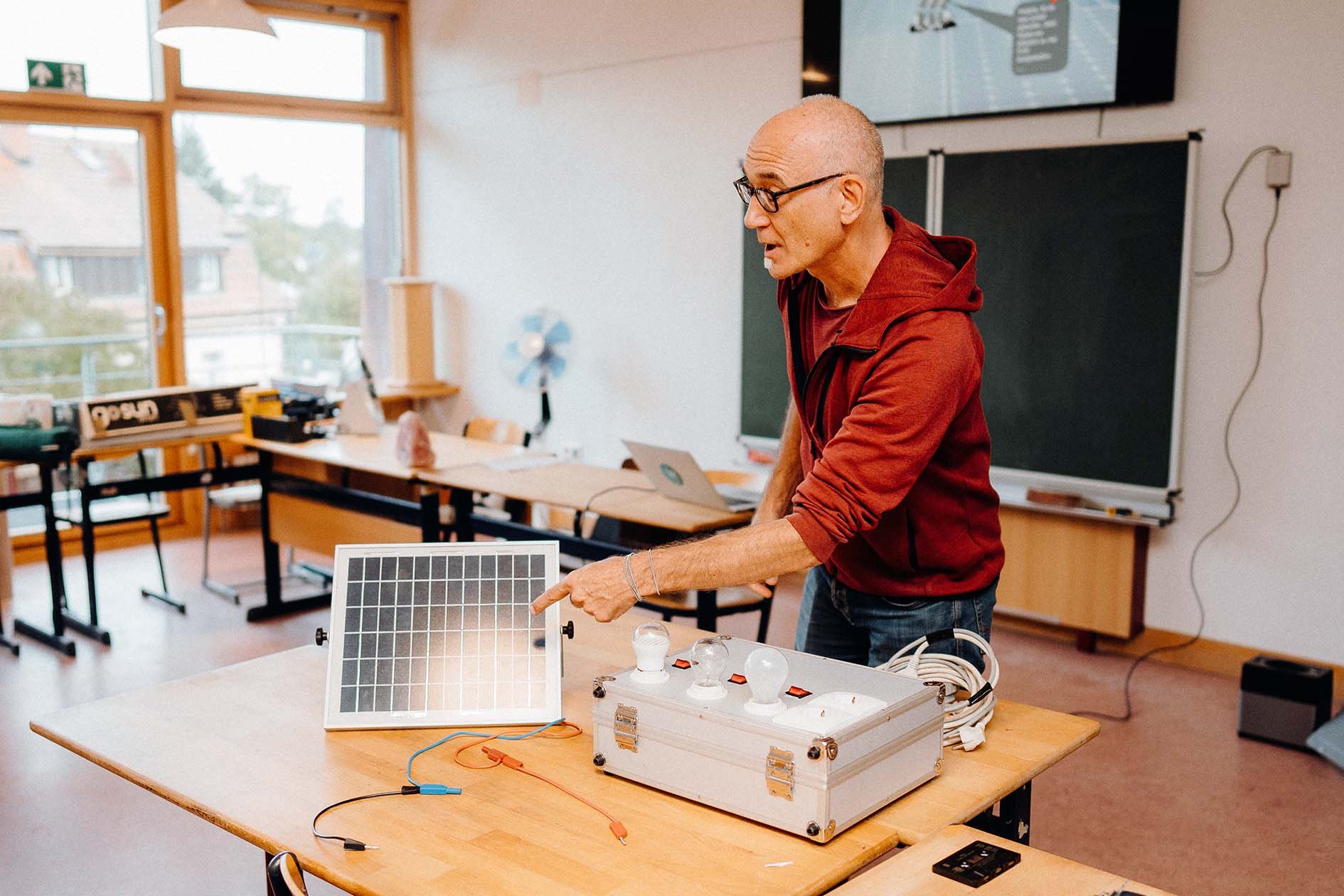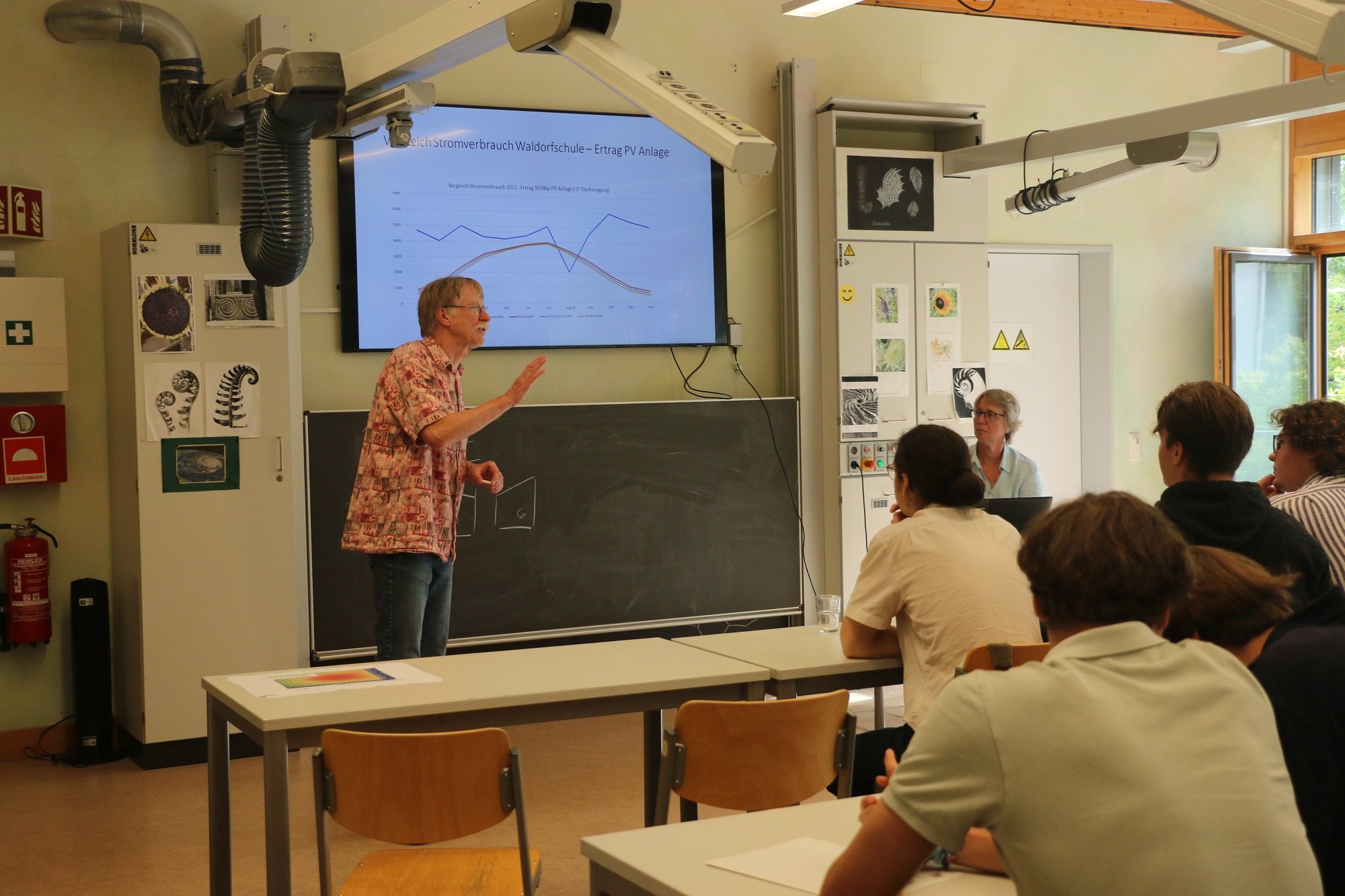 Mit dem Thema „Strom aus Sonnenenergie“ beschäftigten sich heute die 7te und 8te Klasse. Unter der Leitung von Physiklehrerin Frau Dr. Kristin Clark wurden verschiedene physikalische Versuche durchgeführt, in Kooperation mit Herr Gross und Frau Schmieding vom Runden Tisch Klima. Frau Dr. Kristin Clark meinte dazu: „Nach Lösen diverser technischer Probleme, kann ich endlich die PV-Anlage und die daraus resultierenden Daten in den Unterricht einweben, damit die Schüler besser verstehen, wie die Grössen Energie, Leistung oder Kilowattstunden zusammenhängen.“ Besonders im Fokus waren die zwei PV-Anlagen der Waldorfschule. Wie funktioniert so ein System? Welche Auswirkung hat die Ausrichtung zur Sonne? Diese und andere Fragen wurden genauer behandelt und mit Hilfe von Versuchen erklärt. Original-Daten wurden ausgewertet. Im Interview fasst eine Schülerin zusammen: „Ich habe so viel darüber erfahren, über das Thema Solar. Ich werde auf jeden Fall auch viel mit nehmen und es hat auch sehr viel Spass gemacht.“