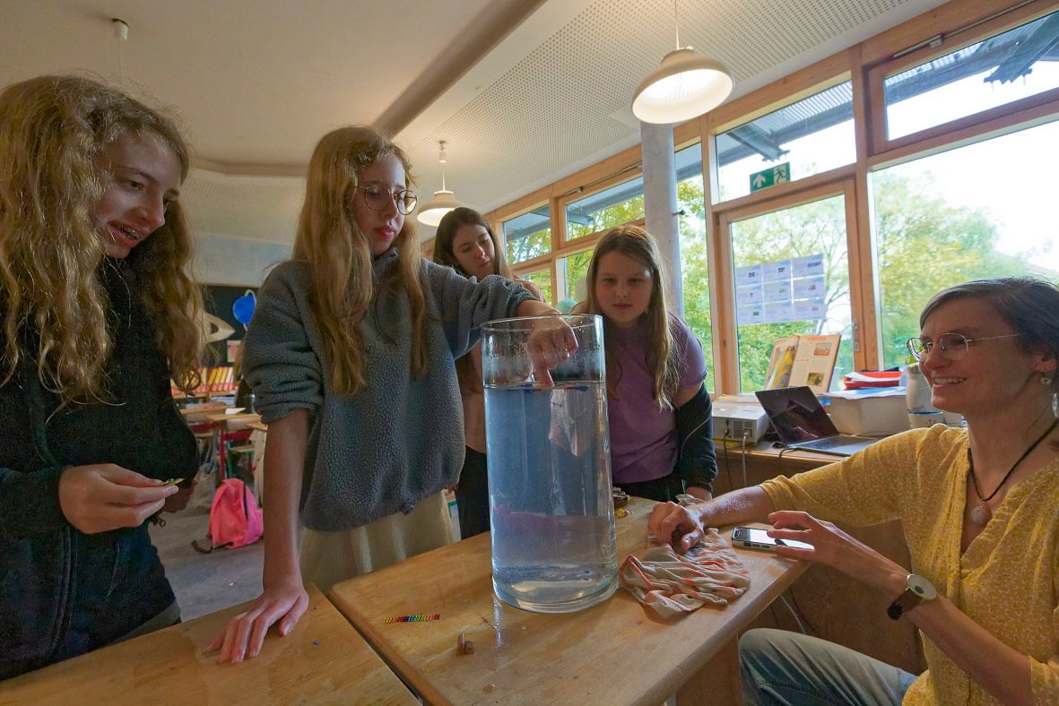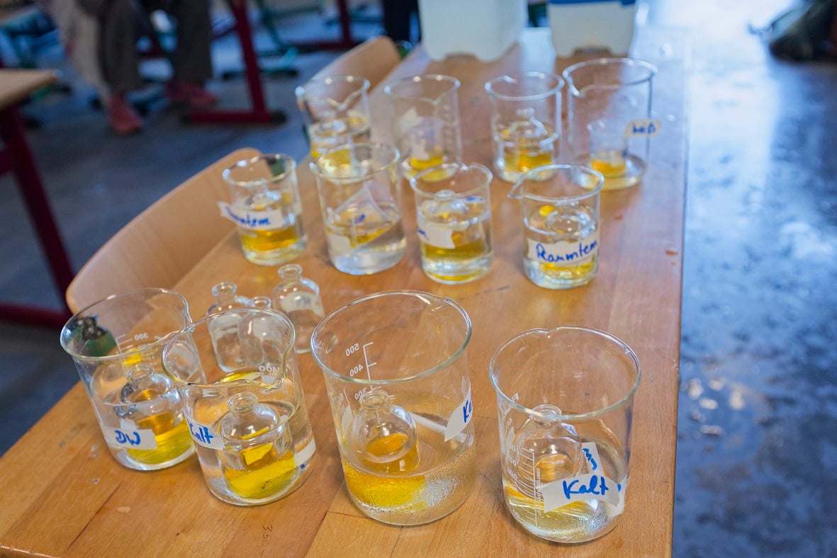 Dabei arbeiteten die Schüler:innen mit Trockeneis, um das CO2 im Wasser sichtbar zu machen. In einem weiteren Experiment, bei dem sie Atemluft durch einen Strohalm CO2 ins Wasser
