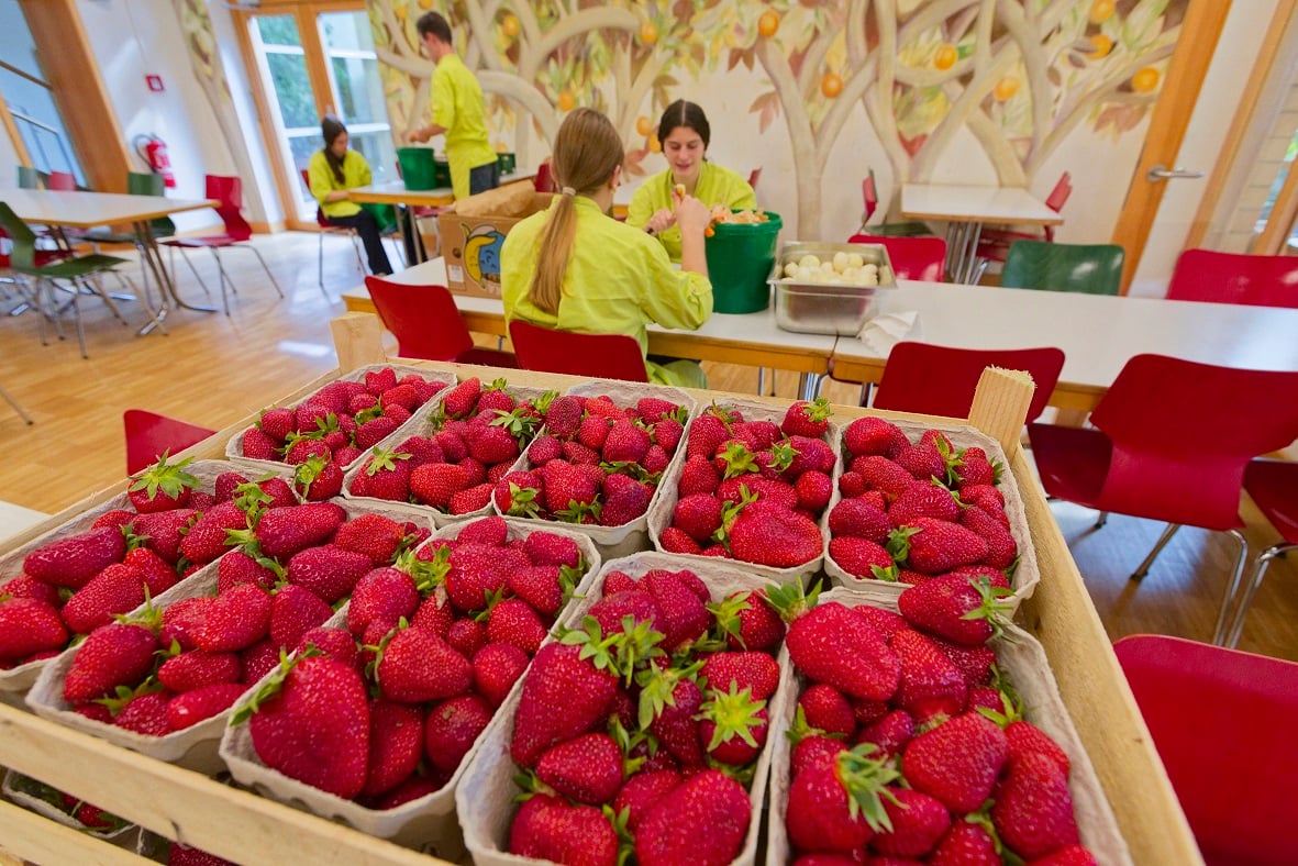 Aus einem mediterranen Gemüseauflauf, selbstgemachter Focaccia und frischen Schoko-Erdbeeren entsteht eine leckere vegane Mahlzeit in unserer Schulmensa. Positiver Nebeneffekt: "Beim gemeinsamen